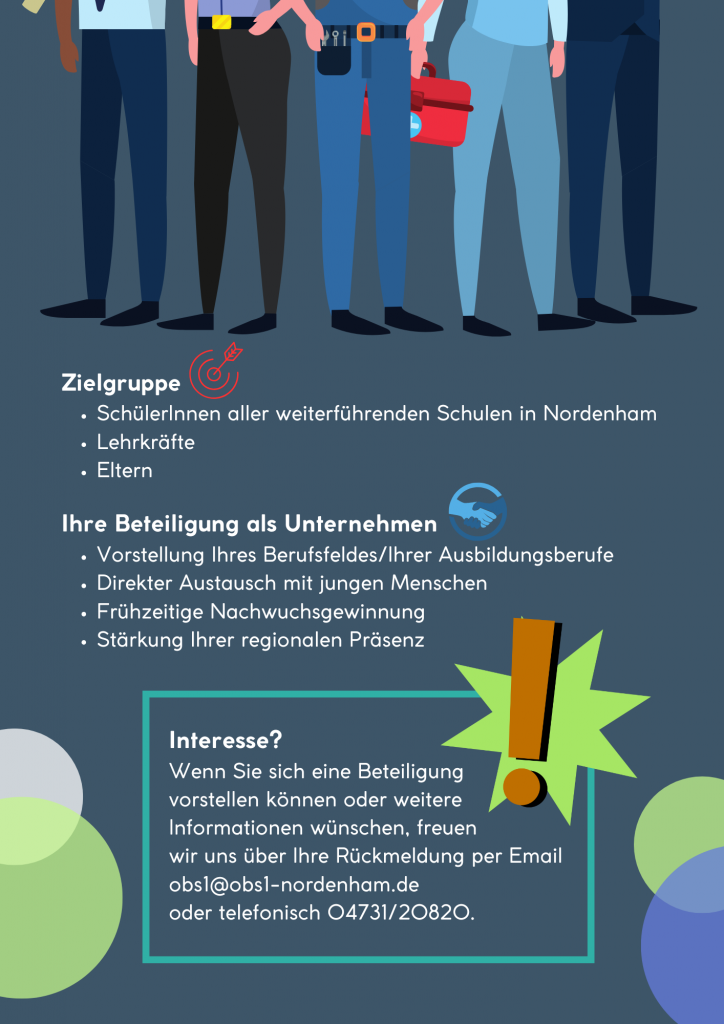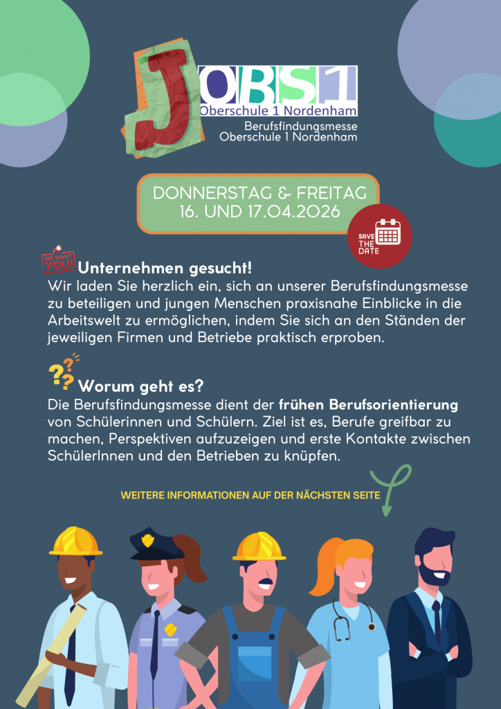 Am 16. und 17. April 2026 findet die erste fachpraktische Berufsorientierungsmesse in der Oberschule 1 Nordenham statt. Ausbildungsbetriebe aus der nördlichen Wesermarsch stellen sich, ihre Arbeit und ihre Ausbildungsplatzangebote vor.
